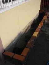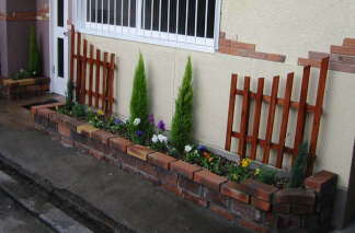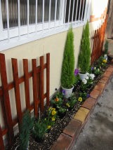 | ご予算の都合上、コンクリート部分は次回ということで、外壁の塗り替えと、ブリックタイルをアクセントに張り付けました。 また、古い室外機、電灯は撤去し、ドアや窓周りは白を基調に塗り替えることで、明るい雰囲気になりました。 古い花壇は、新しい土と入れ替えました。既存のレンガにもう一段増し積みすることで、土を深くすることができました。 最低限の植栽ですが、日当たりの良い場所でしたのですぐに成長するでしょう。 右下の写真は、植栽のイメージを見ていただく為、ポットのまま借り置きしているところです。 床面のコンクリート部分が今後の課題です。 |