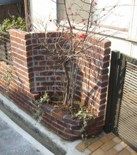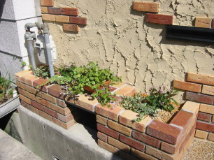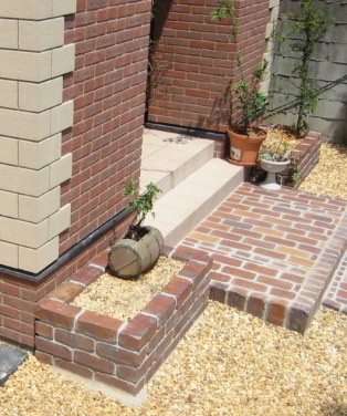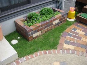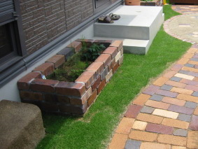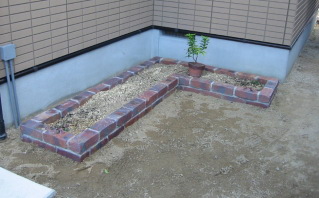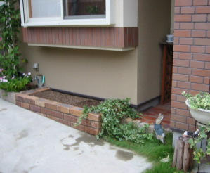 地植えなさっていたスペースを、レンガ花壇にさせて 頂きました。傾斜地ですので水平に補正し、土を深く 入れることで、出窓下でも保水性が高くなります。
