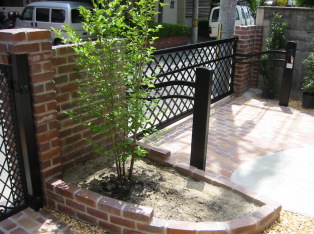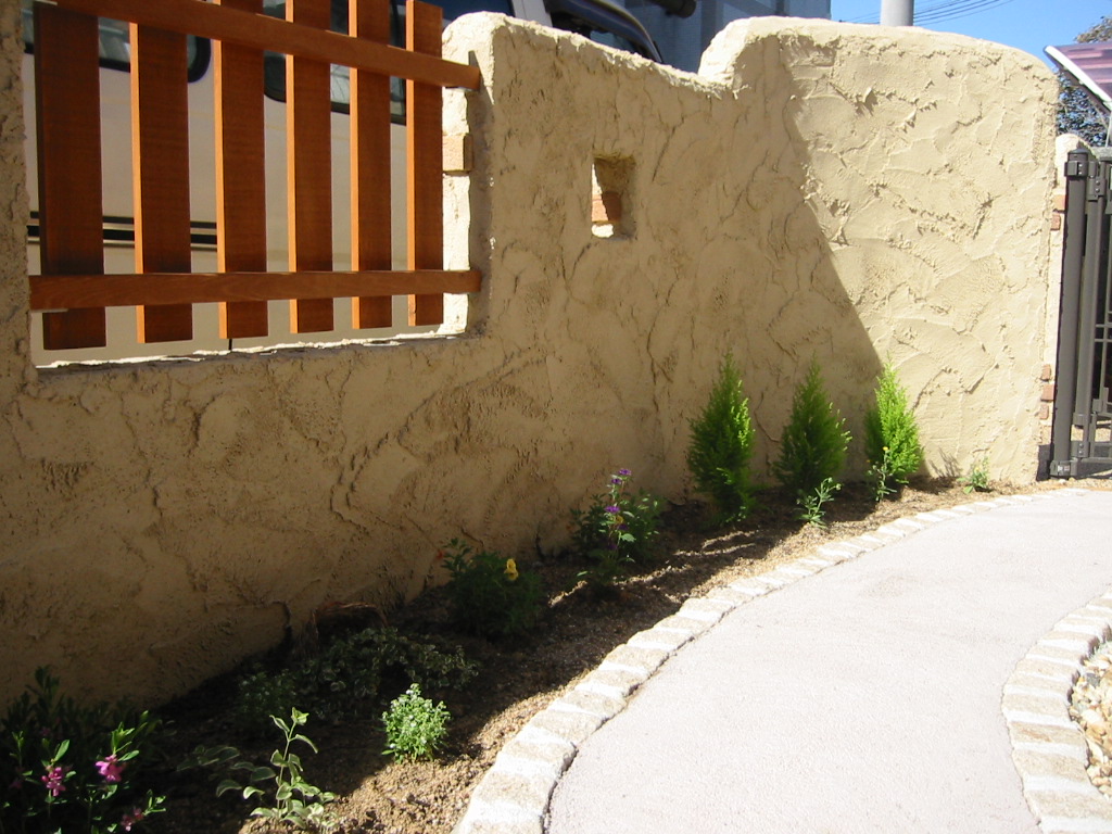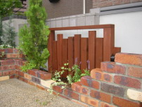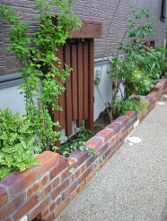 塀と境界の間などのちょっとしたペースは花壇にすると 手入れもし易いちょうどよい大きさに仕上がります。 新たに土壌を整え、植栽を施します。 もちろん既存の樹木を活かすこともできます。 (水道メーターの処理) アクセントにウッドフェンスを立てました。 センサーを入れたライトを組み込んでいます。 建物と庭との高低差をバランス良く演出する のと同時に、つる性の植物をはわせて、 高さのある植栽を楽しむことができます。