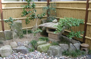 人工竹フェンスの施工と同時に、灯篭や石を移動して 植栽コーナーを作りました。石材等の追加はせず、 お庭に散らばっていた石や樹をまとめました。 室内からのフォーカルポイントを一点に集め、 同時にガレージを広げることができました。