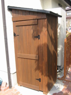 給湯器の目隠しを兼ねたガーデンシェッド(物入れ)です。 H200、W(本体)82、D70cmのウェスタンレッドシダー製。 基本はSPFと合板の2×4構造、屋根はアスファルトシングル 葺きで住宅と同じです。キシラデコール(ウォルナット)仕上げ。 デザイン、サイズは設置場所と用途次第。こちらで88,000円 |