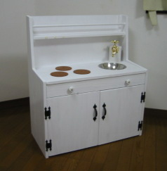 流行のままごと用木製キッチンです。 おおまかなサイズやデザインを指定して頂ければ アレンジしてお造りします。こちらは18mm厚のパイン材で 蛇口は本物、引き出しのつまみは真鍮&陶製と本格的。 H85、W75、D35cm。30,000円頂きました。 |