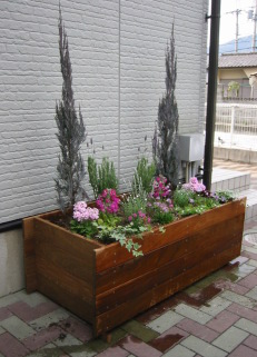 移動式で大型の木製プランターです。 H45、W130、D50cmと、ちょっとした花壇程の大きさです。 ハードウッドのイペですので、腐朽の心配はありません。 結構な量の土(地植え並み)が入りますが、キャスター付き ですので、陽だまりの特等席に楽々移動できます。 |