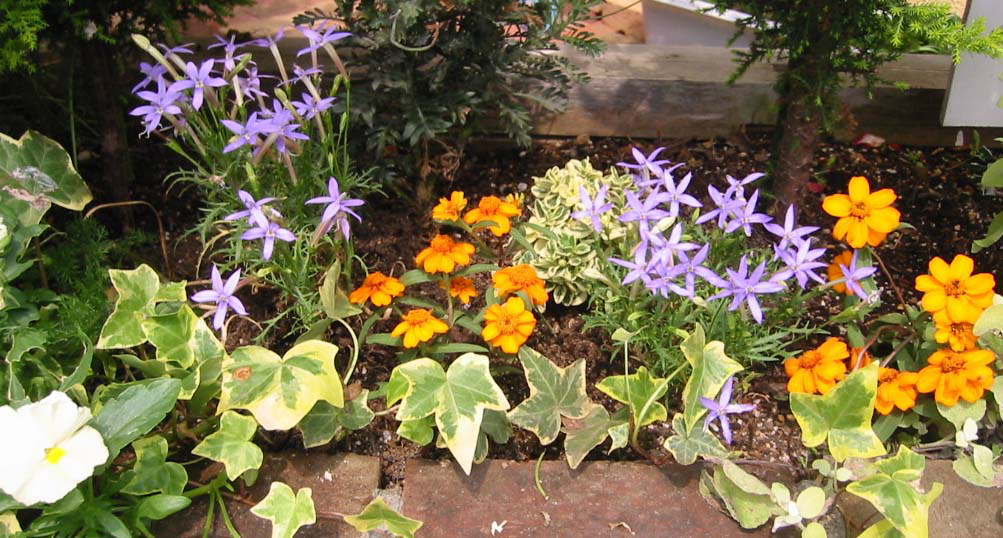 淡いブルーのイソトマとオレンジのジニア・リネアリス
