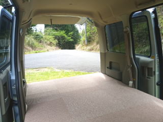 1.8×1.2m程のフラットな空間は2人就寝では十分な広さです。ハイルーフ車ですので頭上空間にも余裕があり、車内で着替えたり長い時間を過ごすのも快適です。