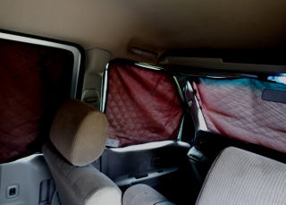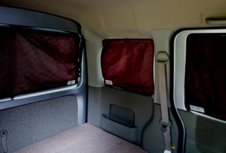 プライバシーガラスとはいえ夜に車内で照明を点けると外から見えますし、見えてなくても視線が気になるもの。ですので、ガラス8面全てに設置できるシェードもご用意しています。布製ですので、使わないときは小さくまとめる事ができます。表地はグレー、内地はブラウンの落ち着く色合いにしました。これで人目を気にせずぐっすり眠れます。また、寒い季節は窓ガラスからの冷え込みを抑える効果もあります。