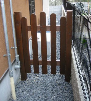 同ページ記載のフェンスとお揃いです。 ウェスタンレッドシダーの4×4材をポスト (支柱)にして、2×4材でゲートを作成。 蝶番と、閉めるとロックするラッチを使用しています。 塗装はキシラデコールのウォルナット、 お家の外壁と同系で少し濃い色です。 基礎部分もフェンスの時と同じく、40cmの深さで モルタル(セメント)で固定しています。 ![]() |