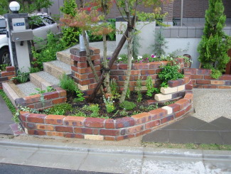 オープン外構のリフォームでした。階段横のスペースに明るい 色合いのレンガを積み、立体的な花壇を作りました。 帰宅される家人や、訪れるお客様を花や緑が迎えます。 |