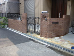【ブリックタイル】 コンクリートブロックの基礎にレンガ調のタイルを貼り、 オーソドックスで高級感のある門周りに仕上げています。 狭小スペースを有効に使える様、塀の角度を工夫しました。 |