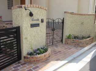 | 【南欧風】 南欧風のラフな塗り壁に個性的なレンガでエッヂング。 目地をいれた敷きレンガとの組み合わせで明るく開放的な 門周りに仕上げました。足元の花壇でお客様を迎えます |