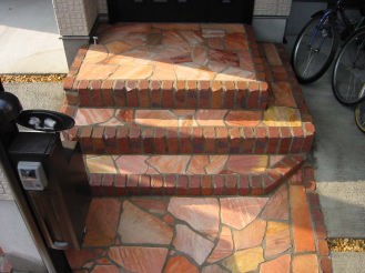 ![]() レンガで縁取ったポーチ及び階段を、天然の乱形石で仕上げ。 ポーチ部分も同素材にすることにより、アプローチからの デザインが統一され、奥行き感が生まれます。 機能門柱は通行を妨げないスリムタイプで、ライトは配線途中に 光センサーを設置しました。ご予算の都合で、素材を有効に使う為 目地を広めにとって敷設面積を広げています。 |