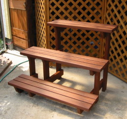 木製のプランター台です。設置場所に応じて作成します。 この場合カーポートの柱を避ける為、最上段の幅を狭くしています。 草花はもちろん、ポットやプランターも引き立ちます。 H100、W120、D65cm、ウェスタンレッドシダーの節無し材 キシラデコールのチーク色で仕上げ。25,000円でした。 |